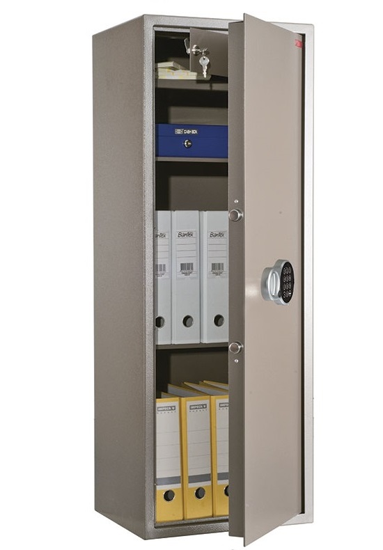 - Толщина лицевой панели составляет 5 мм. Дверь запирается электронным замком PLS-1, защищённым от подбора кода; предусмотрен аварийный мастер-ключ.