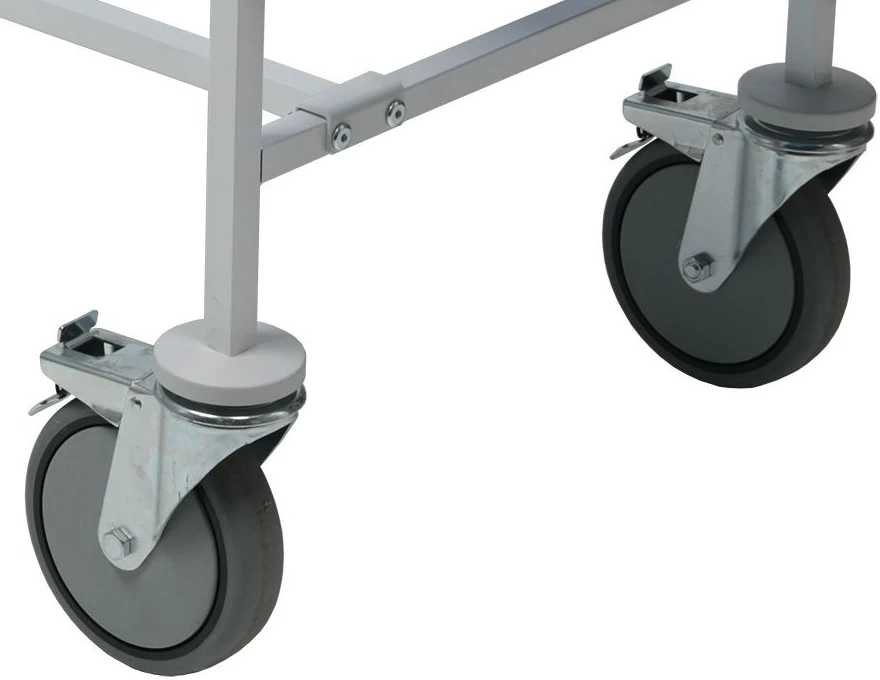 - Самоориентирующиеся колёса диаметром 20 см выполнены из серой резины, не пачкающей пол. Два колеса снабжены тормозными устройствами.