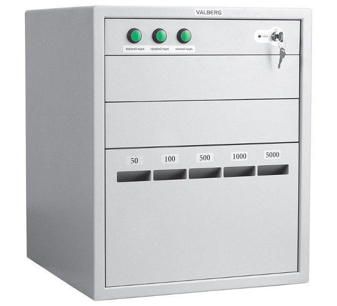 Нижний ящик снабжен 5-ти секционной кассетой для хранения депонируемых банкнот раздельно по номиналам. Вместимость одной секции до 1500 купюр (в пачках)